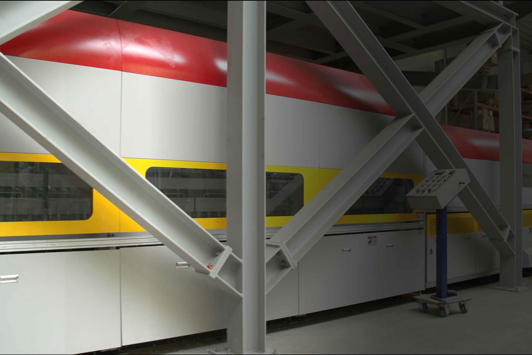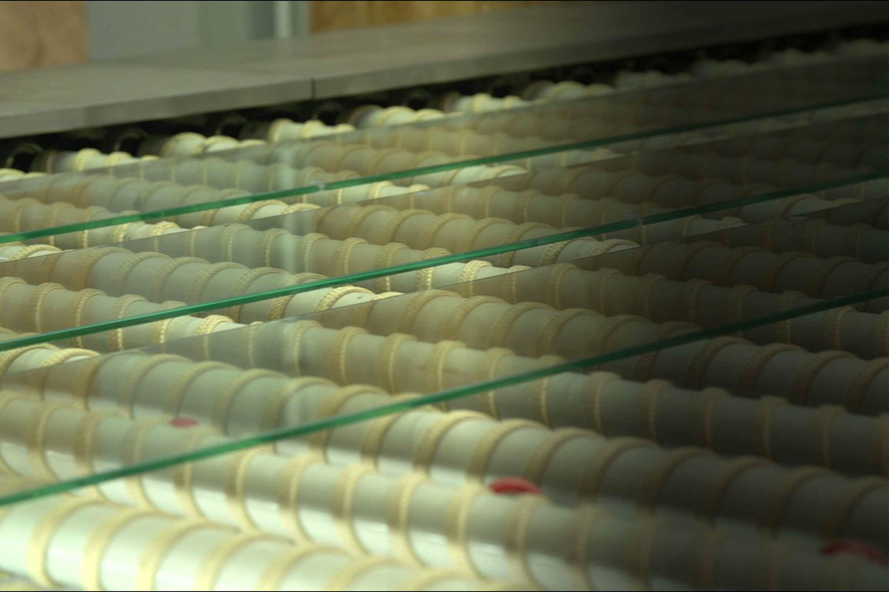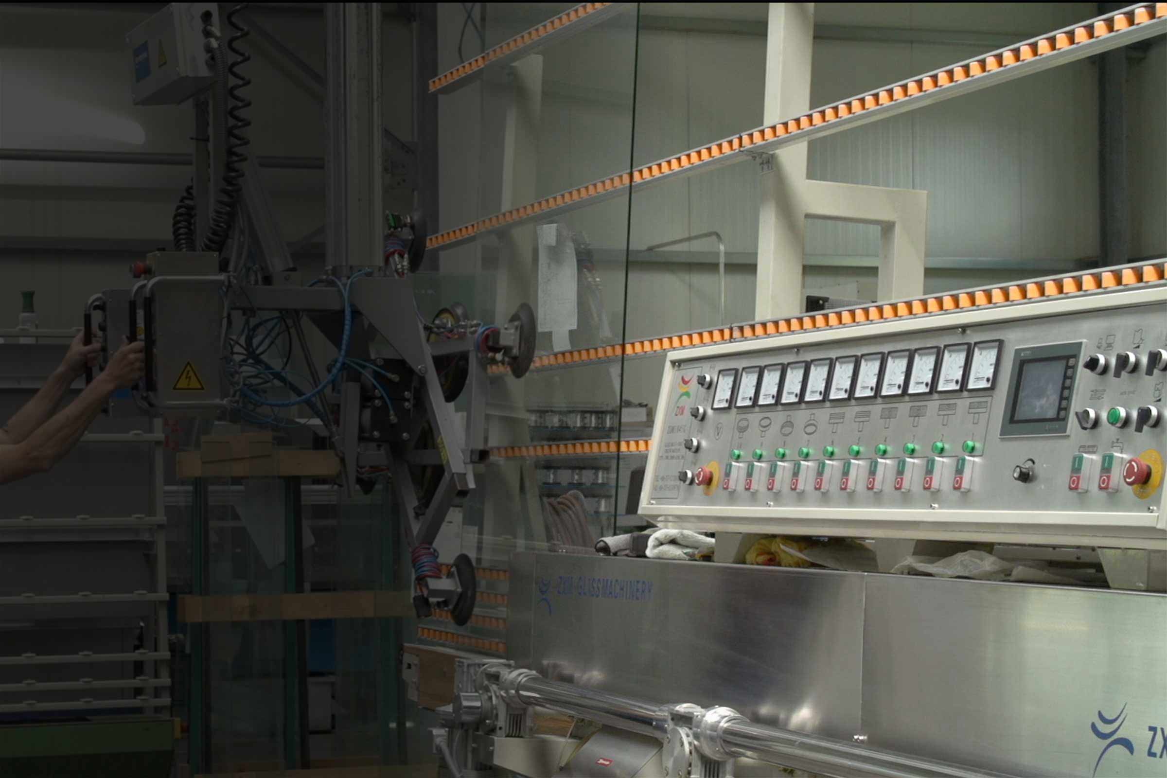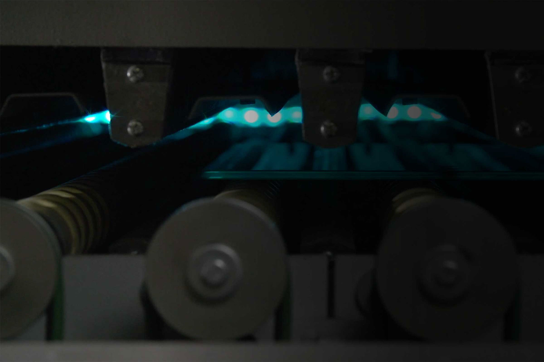 Herzstück in der Blackbox ist unser ca. 25 m langer Hochkonvektionsofen. Damit können wir die schnelle Lieferung von Sonderformaten garantieren. Hier wird das fertig zugeschnittene und bearbeitete Floatglas für einige Minuten auf über 700° C erhitzt und danach schockgekühlt. Einscheibensicherheitsglas entsteht, das jetzt deutlich widerstandsfähiger gegen Druckbelastungen und Temperaturschwankungen ist.